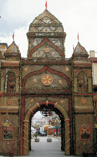 Il centro da cui si sviluppa questa maestosa e preziosa esposizione è la Chiesa Madre in corso Umberto I e da questo punto, ideale baricentro del corso principale, gli artisti delle due confraternite danno sfoggio delle loro grandi capacità creative confrontandosi in una gara di reciproco superamento ma che presenta un’unica scenografia che si conclude o inizia nei due prospetti di accesso. Anticamente venivano eretti soltanto due archi centrali, con i telai triangolari di ferle e con gli intrecci di canne decorati con ciambelle di pane ed orlati di arance. Nel tempo tutto si è andato arricchendo sempre di più. Oggi la bravura degli esecutori si manifesta nell’attenta ricerca dei particolari, nella tecnica raffinata che esalta persino i dettagli dai singolari effetti plastici e figurativi. Cupole, campanili, volte, rosoni, fatti di canne e di salice. Originali lampadari, le nimpe, realizzati con datteri, fontane zampillanti con al centro veri e propri monumenti di grande efficacia comunicativa ed ancora mosaici - raffiguranti episodi evangelici - creati con i prodotti della natura e dove il pane è elemento essenziale dell’addobbo.