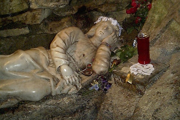 Un angusto e basso budello scavato nella roccia rende possibile l’accesso alla grotta dove all’interno è stata collocata una statuetta della santa, databile alla metà del ‘700, perennemente illuminata dai ceri portati dai fedeli. Dall’interno del santuario, attraverso una botola posta al centro della chiesa, è possibile accedere ad una cripta sottostante dove venivano sepolti i cadaveri degli eremiti dopo essere stati disseccati secondo un procedimento usato dai Monaci Cappuccini di Palermo. Nei loculi della cripta sono ancora oggi visibili i resti di alcuni eremiti vissuti nel santuario il secolo scorso.